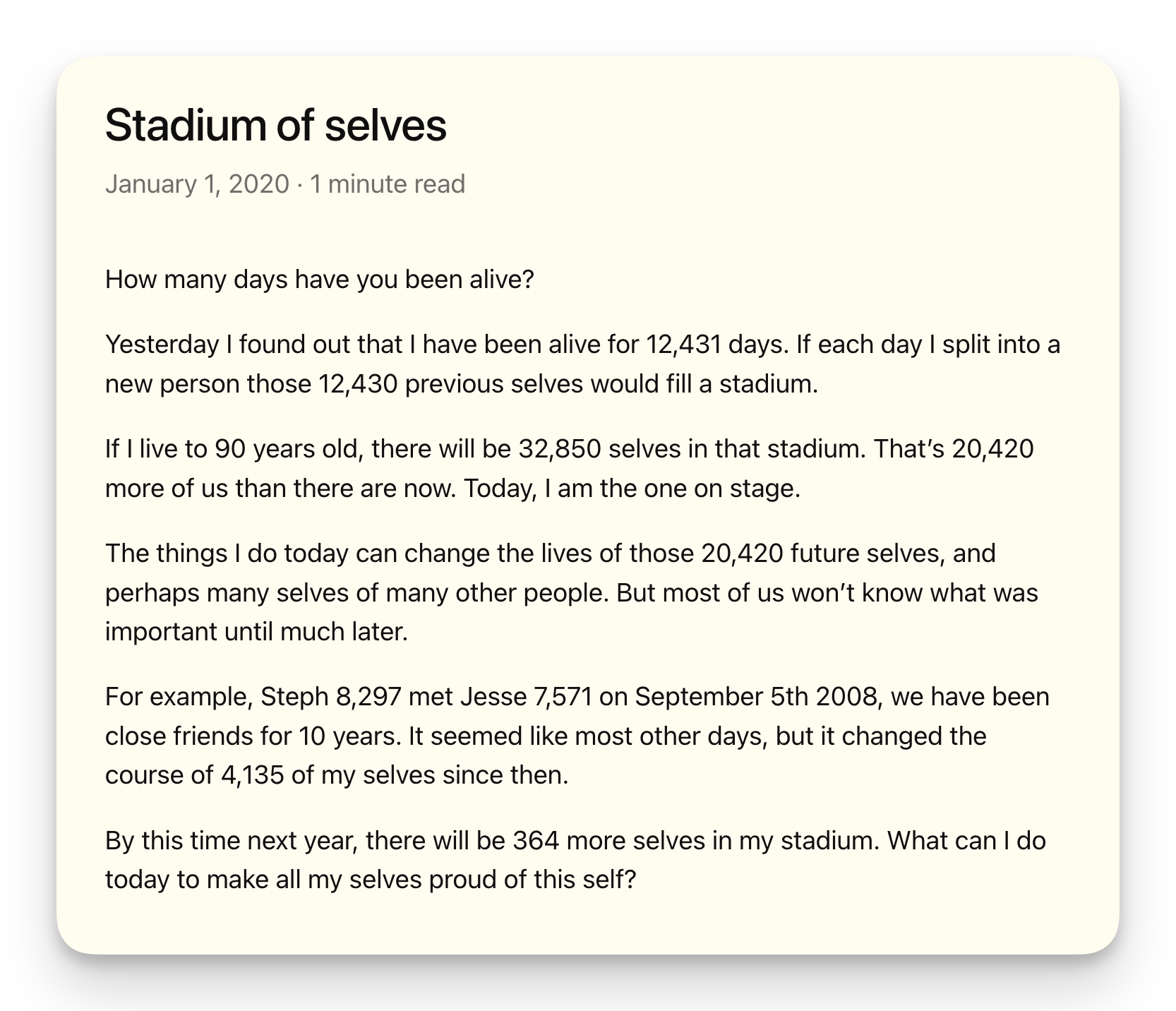 Steph Ango, CEO of Obsidian, wrote this beautiful 1-minute essay called Stadium of selves.
